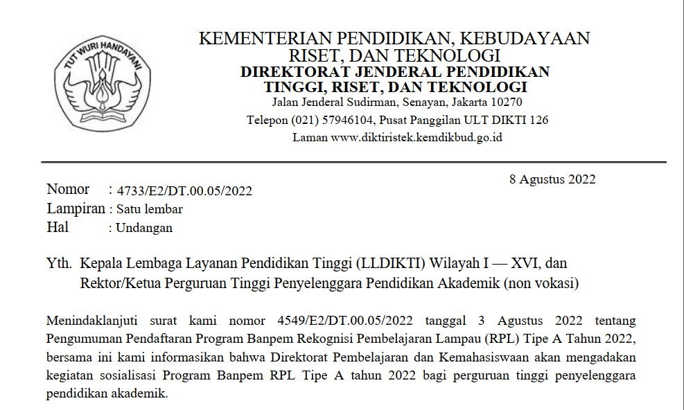 Menindaklanjuti surat Direktur Pembelajaran dan Kemahasiswaan nomor 4549/E2/DT.00.05/2022 tanggal 3 Agustus 2022 tentang Pengumuman Pendaftaran Program Bantuan Pemerintah Rekognisi Pembelajaran Lampau (RPL) Tipe A Tahun 2022, bersama ini kami informasikan bahwa Direktorat Pembelajaran dan Kemahasiswaan akan mengadakan kegiatan sosialisasi Program Banpem RPL Tipe A tahun 2022 bagi perguruan tinggi penyelenggara pendidikan akademik.