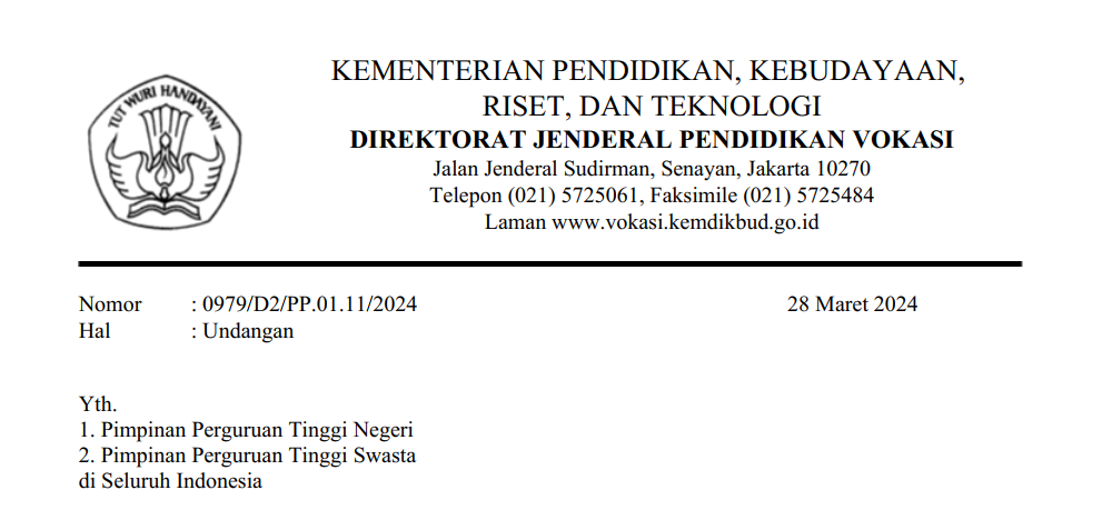 Sehubungan dengan hal tersebut, dengan hormat kami mengundang Bapak/Ibu Pimpinan PT untuk hadir pada kegiatan Sosialisasi Pendampingan Pelaksana Program SMK PK oleh Perguruan Tinggi Tahun 2024, yang akan diselenggarakan pada: