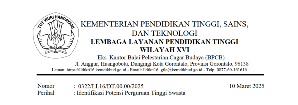 Dalam rangka mewujudkan visi Kementerian Pendidikan Tinggi, Sains dan Teknologi untukmewujudkan keberdayaan perguruan tinggi yang bertanggung jawab dengan tata kelola yangbaik untuk bertumbuh dan berdampak, LLDIKTI Wilayah XVI bermaksud melakukanpemetaan potensi perguruan tinggi yang dapat dikolaborasikan dengan multi pihak sehinggaberdampak positif bagi masyarakat dan mencapai tujuan nasional, khususnya pencapaian Visidan Misi Presiden melalui Asta Cita, 17 Program Prioritas dan 8 Program Hasil Terbaik Cepatyang ditugaskan ke Kemdiktisaintek (terlampir).